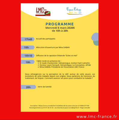La projection sera suivie d'un débat en présence d’experts de la Leucémie Myéloide Chronique et de témoignages de patients,animé par Perrine MALZAC.
